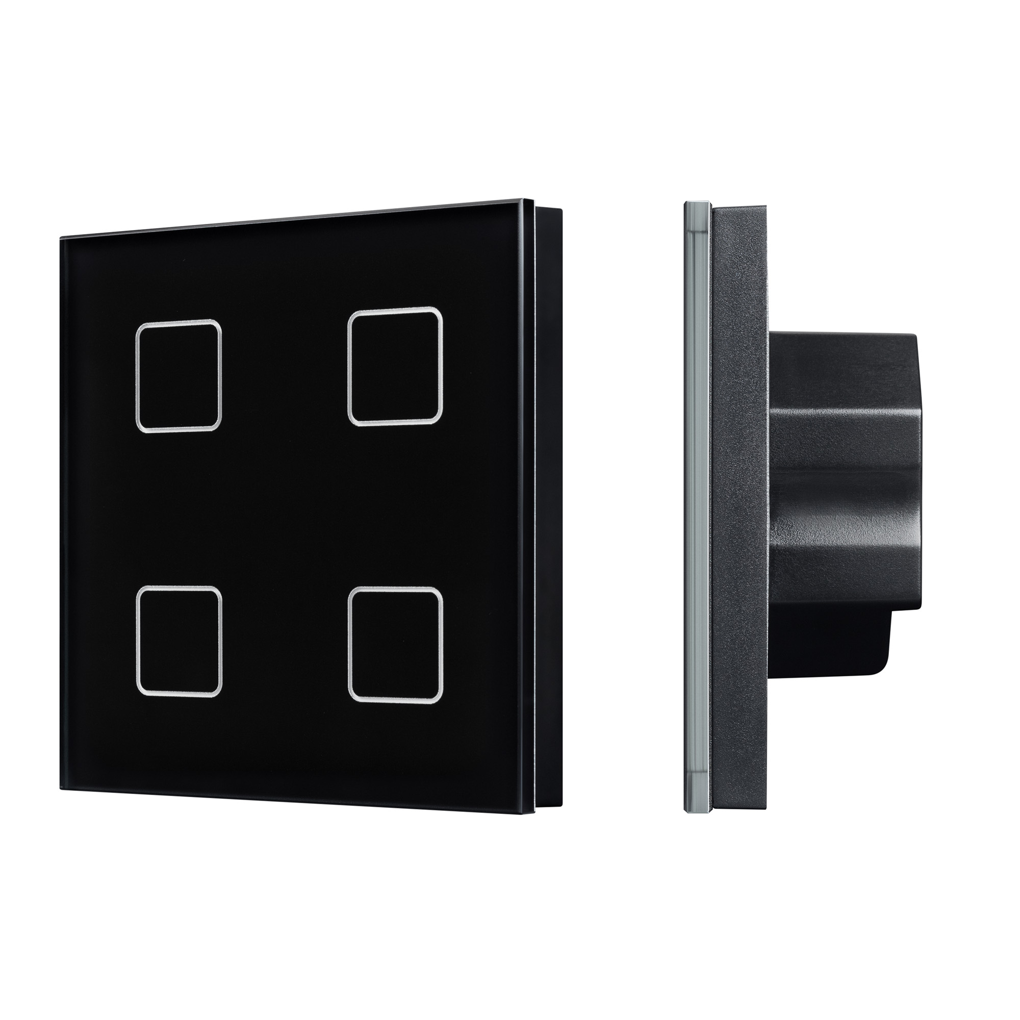 Встраиваемая стеклянная сенсорная панель DALI. Цвет - чёрный. 4 кнопки, управление 4 адресами DALI. Каждой кнопкой выполняется включение, выключение и диммирование по соответствующему ей адресу. Установка стартового адреса управления выполняется переключателями на корпусе. Питание 24VDC, либо по шине DALI. Подсветка кнопок, датчик приближения, звуковой сигнал срабатывания. Габариты 86x86x34.5 мм